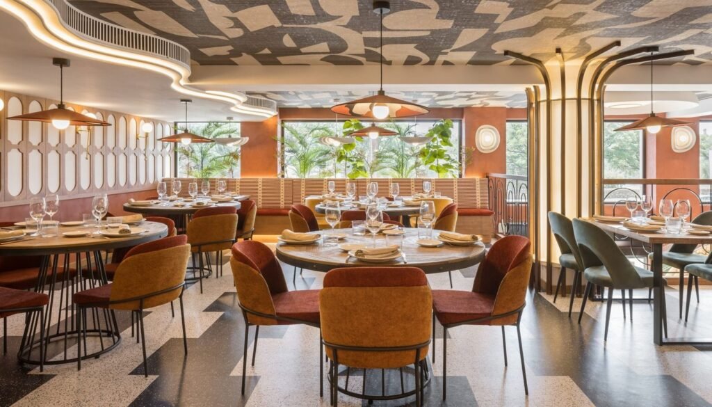 Los colores, por su parte, influencian el estado emocional. Tonalidades cálidas como terracota, mostaza y maderas naturales evocan comodidad y sociabilidad, mientras que tonos fríos o neutros pueden sugerir tranquilidad y sofisticación. Elegir la paleta adecuada implica un análisis previo del concepto del restaurante, el tipo de cocina y la atmósfera deseada.