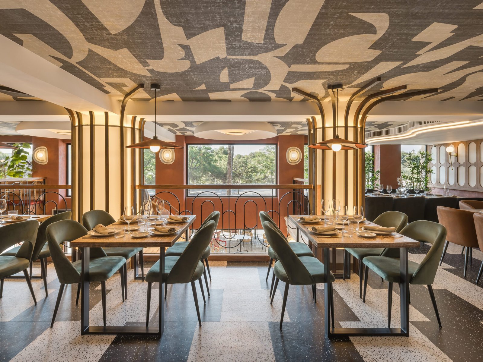 Las paredes del restaurante no están simplemente revestidas: están intervenidas artísticamente con pinturas exclusivas que simulan la profundidad del mar, las olas, las corrientes y la luz marina. Este trabajo convierte el espacio en un universo inmersivo, donde el azul profundo dialoga con los ocres cálidos y verdes matizados que recuerdan la vegetación costera.